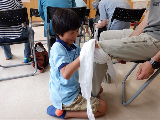 36.このようにして・・・。消防の救急隊員が講師で教えてくれています。感謝です。三角布での膝の保護のやり方ですね。
